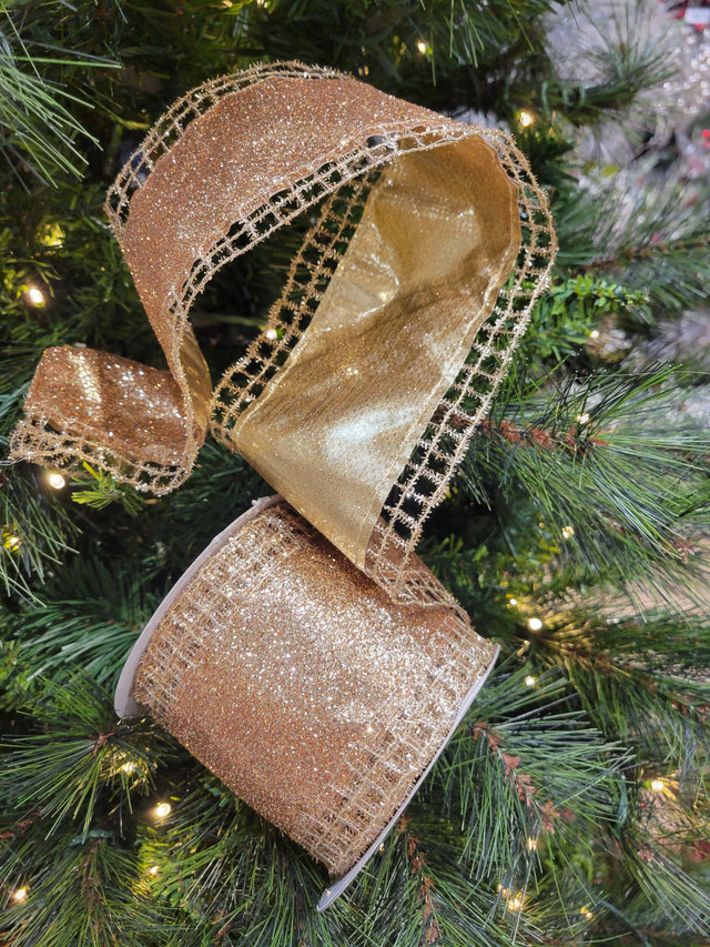 4"X10YD rose gold textured tinsel face, mesh edge, gold lame backing