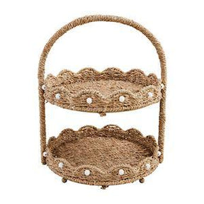 Seagrass wrapped metal stand features scalloped seagrass serving tiers with wood bead detail.