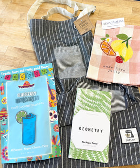 This easy-to-give bundle includes our Make Life Fruity Tea Towel, Fresh Stripe Pantry Apron, D'Marie Blueberry Margarita Slush Mix, and Geometry Swaying Leaf Not Paper Towel.
