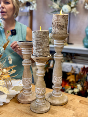 Artichoke Design Hand-Carved Wood Candle Holders. Solid Mango Wood with Honey Stain and Whitewashed Finish. Black Metal Candle Plate for Safety. Holds 3" Diameter Pillar Candles.