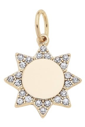 The Pave Sun Charm in Shiny Gold features a sun design covered in pave stones for added sparkle. This charm symbolizes warmth and positivity, making it a bright addition to your jewelry. DETAILS Base Metal with Shiny Gold Plating 1"L x .625"W