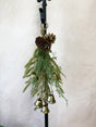 Small antique brass finished bells drape from a clutch of glittering mixed greenery and pine cones. These bells have a sweet and cheerful chime and are one of the prettiest you could ask for sound-wise. Each bell measures approx. 1.5" tall.