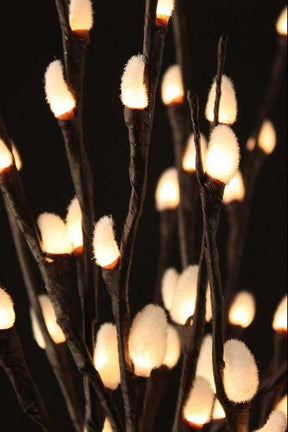 Nature, illuminated! Warm white LED bulbs are hand wired into 5, 40" tall pussy willow stems, casting a subtle glow. Standard 110V electrical supply connects to a 24-Volt adapter.