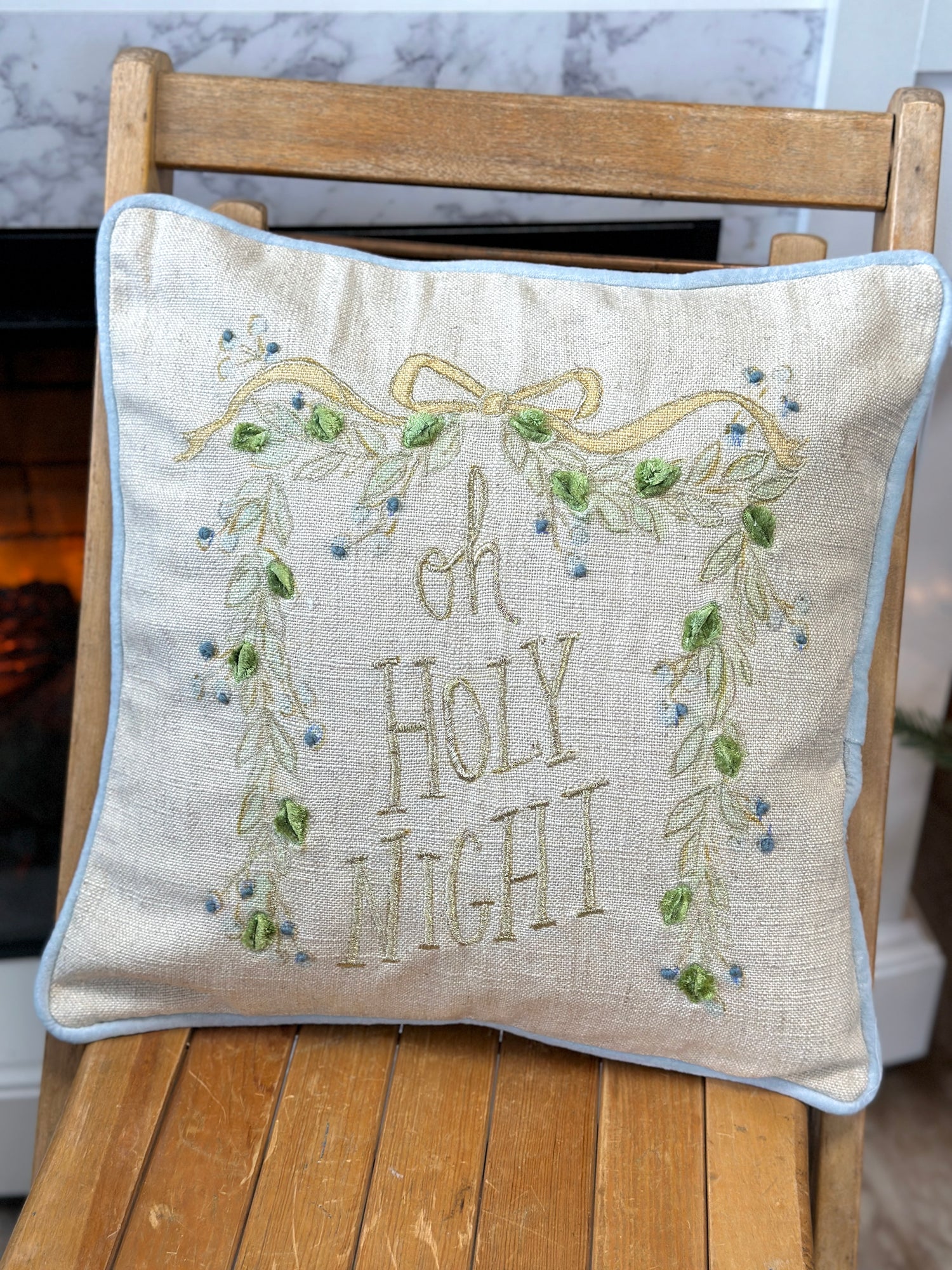 16" Square Cotton & Linen Printed Pillow w/ Embroidery, Piping & Velvet Back "Oh Holy Night", Multi Color
