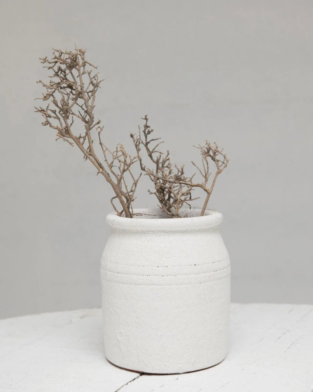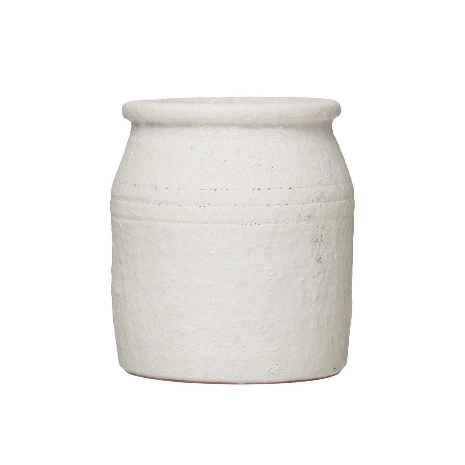 6-1/4" Round x 7"H Decorative Coarse Terra-cotta Crock, Volcano Finish, Distressed White (Each One Will Vary)