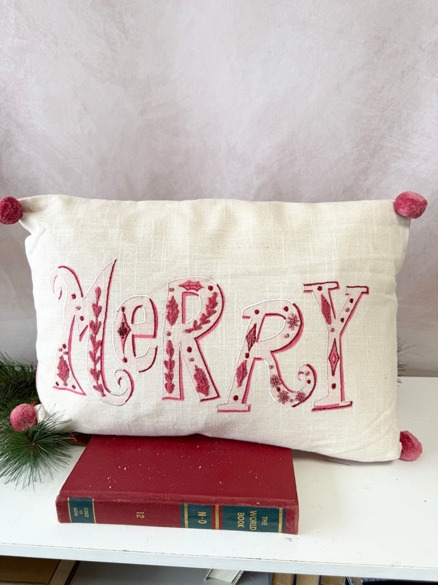 20"L x 14"H Slub Printed Lumbar Pillow w/ Embroidery, Beads, Pom Poms & Velvet Back "Merry", Pink, Red & Cream Color