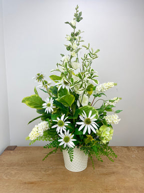 This porch pot is made of high-quality outdoor safe silk floral stems.