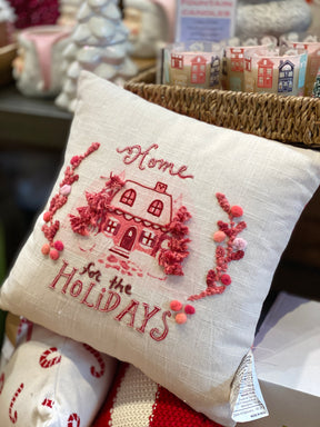 16" Square Cotton Slub Printed Pillow w/ Embroidered House Image, Pom Poms & Velvet Back "Home For The Holidays", Pink, Red & Cream Color