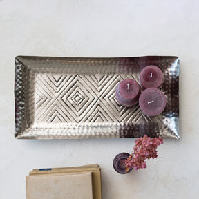 Intentionally curate an elegant, storied space with our thoughtfully crafted collection of trays and pedestals. Peruse a vast selection of unique, display-worthy pieces designed to individualize a space of any style including trugs, catch-all's, vanity trays, handled trays, tiered trays, footed trays, decorative pedestals, and so much more. Choose from a wide array of materials from solid wood and genuine marble to aluminum and leather, and styles from classic farmhouse and mid-century modern to vintage glam and boho. Create a customized arrangement of treasures and trinkets on a mantelpiece, bookshelf, or dresser for a personalized display full of color and texture. This global-inspired aluminum tray showcases an intricately stamped geometric pattern in a shimmering finish. Display in a living space of any style from cottage to transitional. Top with a collection of decorative accents. Made from aluminum.