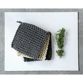 Pot holders are customer favorites. Functional, and they also look great hanging on the wall in a kitchen. Made with cotton. Hand wash cold. Lay flat to dry. Comes in 3 colors.