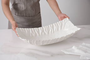 Rectangular Centerpiece from our Mascali Bianca Collection. Perfect for a gorgeous table focal point or for serving main courses and large sides! This all-purpose piece makes an easy transition from oven to table. Versatile high-fired porcelain pieces that are microwave safe! Food safe, tarnish free, dishwasher safe, oven safe to 500°. Easy Care.